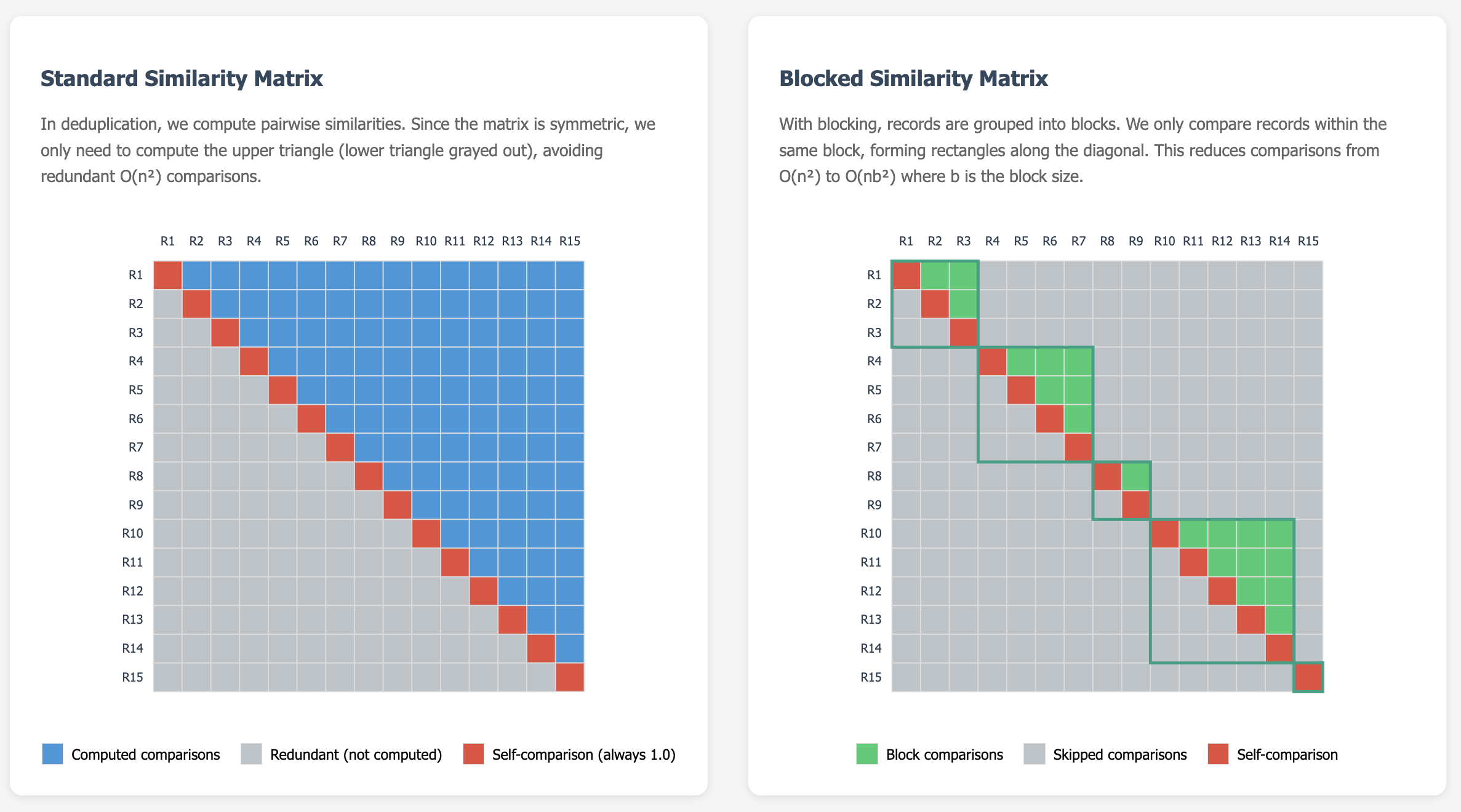 - ขั้นตอนที่ 1: Normalization เราทำการ normalize ข้อมูลเพื่อให้การ blocking และ deduplication ทำได้ดียิ่งขึ้น เช่น หนึ่งชั่วโมง, 1 ชั่วโมง ปรับให้เป็นฟอร์แมตเดียวกันเพื่อให้ง่ายต่อการทำ blocking หรือการจับกลุ่มข้อมูลเพื่อหาความซ้ำซ้อนนั่นเอง