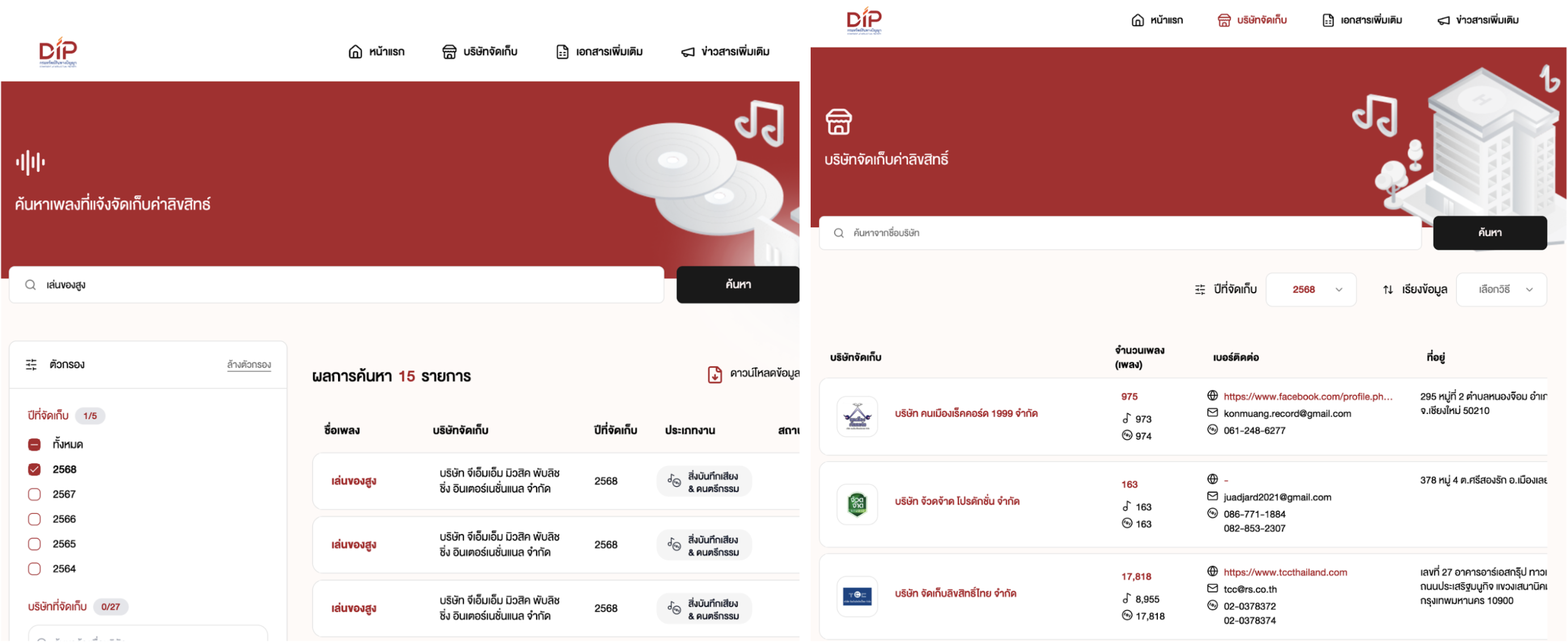 ดังนั้นการค้นหาเพลงจึงทำได้ยาก เราอยากให้ระบบทำงานได้ง่ายขึ้นและประชาชนเข้าถึงเพลงต่างๆได้ดียิ่งขึ้น เช่น ถ้าเราเป็นร้านค้าที่อยากเปิดเพลง “เล่นของสูง” เราสามารถค้นหาเพลงเพื่อดูว่าบริษัทใดเป็นผู้ถือลิขสิทธิ์เพลงเล่นของสูง และเข้าไปดูอัตราจัดเก็บลิขสิทธิ์ของบริษัทนั้นได้ จากนั้นก็เข้าไปดูรายละเอียดของบริษัทเพื่อติดต่อและสอบถามต่อกับทางบริษัทจัดเก็บได้ สำหรับใครที่ยังไม่เห็นภาพ อาจจะเข้าไปทดลองใช้งานได้ที่ copyright-song.ipthailand.go.th